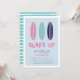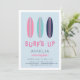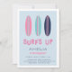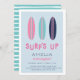 Convites de aniversário de verão bonitos para a sua pequena surfista na praia, apresentam um trio de ilustrações da prancha de surfe em marinho, rosa e aqua. "Surf" aparece em letras retrorreflectoras, com seus detalhes de festa de aniversário embaixo.