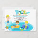 Comece a comemorar com este convite adorável. Perfeito para a piscina daquele aniversariante. Tem um fundo branco. Há uma grande piscina de natação com um adorável, bonitinho ao seu lado numa poça de água. Ele tem cabelos loiros e óculos azuis na cabeça. Na piscina está um rapaz loiro giro flutuando numa balsa azul. Ao lado dele está outro garoto de cabelo marrom flutuando também. No topo do convite está a palavra piscina. Os dois O's na piscina são tubos coloridos. Veja os muitos outros produtos e designs nesta linha da piscina. ©JW Ilustrations