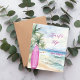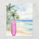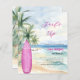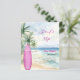 Um convite para uma festa de aniversário de praia para uma garota. Uma praia arenosa de cor aquática, ondas oceânicas e palmeiras como fundo, e uma prancha rosa na praia. 1 folha = 1 convite impresso de borda a borda.