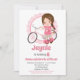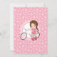 O convite para o aniversário desta garota mostra uma garota marrom e cabeleira com sua bicicleta rosa. Em um fundo de sotaque giro cor-de-rosa e branco com pontos e garota atrás.