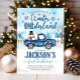 Uma terra de inverno!! Aproveite este marinho azul de inverno na Wonderland natalícia! É a maneira perfeita de convidar convidados para a festa de aniversário do Natal ou do inverno do seu filho. Este convite de aniversário desenhado com um caminhão azul-marinho vintage com um boneco de neve contra uma paisagem de neve!