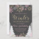 Wonderland Winter ou Winter Onederland Convite de aniversário com flocos de neve cor-de-rosa, dourados e prateados e árvores de inverno reluzentes com fundo de quadro-negro.
