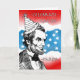 Convite de aniversário patriótico com Abraham Lincoln vestindo um chapéu de festa de aniversário e um design vermelho, branco e azul com listras e estrelas atrás dele. Celebrar, rir e festejar escrito no cobrir. Personalize o dentro de informações de sua parte como quiser antes de fazer check-out. Arte, imagem e direitos de autor versos © Shoaff Ballanger Studios, 2022.
