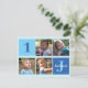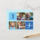 Convite de aniversário quadrado para foto de bebê menino ou criança. Celebre o aniversário do seu filho com fotos fofas deles neste cartão postal com sua própria fotografia e adoráveis quadrados azuis. Adicione o nome e a idade deles.