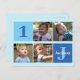 Convite de aniversário quadrado para foto de bebê ou criança. Celebre o aniversário do seu filho com fotos fofas deles neste cartão postal personalizado com quadrados azuis adoráveis. Adicione o nome e a idade deles.