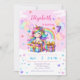 Convite de aniversário arco-íris pastel de unicórnio, menina adorável - lavanda rosa e roxo, pintável, com unicórnio sentado em presentes.