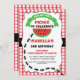 Este convite de aniversário de piquenique para meninas apresenta uma fatia de melancia, uma faixa de fita verde, formigas, quadro decorativo branco e um padrão de xadrez vermelha e branca. A design também inclui uma faixa preta. Queria criar um convite de aniversário de piquenique para a loja porque não tenho um no momento. O mesmo design de convite com a fotografia está disponível na loja, assim como adesivos de aniversário. Esse convite de aniversário de piquenique ou melancia está pronto para ser personalizado.