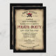 Ahoy Matey! Há um Partido Pirata no seu futuro! A design de diversão apresenta um pergaminho velho, envelhecido, com um X esmaecido marcando o ponto e vigiado por um crânio de um olho e ossos cruzados. Este convite de festas temático pirata define o palco para a festa de troca de excelentes em loja para seus convidados.