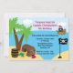 Comece sua festa com nosso adorável Convite de aniversário pirata da Ahoy Mates apresentando uma cena de praia com um baú do tesouro, palma e bandeira pirata. Perfeito para um primeiro aniversario ou qualquer aniversário... apenas mude o aniversário. Totalmente personalizável por você com suas informações. ©Babystar Designs