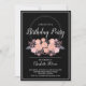 Esfregue rosas cor-de-rosa e coral em qualquer convite de aniversário etário com folhas cardíacas de brilho rosa sobre fundo preto. Elegante com uma tipografia moderna na moda.