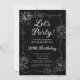 Convite de aniversário preto e branco do Partido do vamos. Este moderno convite de aniversário combina tons brancos e negros, elegantes linhagens e flores luxuosas. Este conjunto de coisas surpreende seus convidados e torna sua festa de aniversário realmente inesquecível. Personalize este convite elegante e na moda com nomes, local, data e hora.