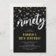 Convites de aniversário 90 modernos com fundo na moda preto, confete branco e ouro, o título 'noventa' em uma fonte de script em negrito e um modelo de texto simples que é fácil de personalizar.