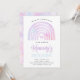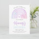 O convite apresenta um arco-íris colorido, em matizes roxas, azuis e cor-de-rosa. Perfeito para qualquer idade.