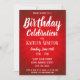 Um convite de aniversário dinâmico com letras de pincel contra um fundo de explosão solar vermelha.