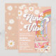 Celebre com um estilo descolado com este convite de festa de aniversário retrô que apresenta um fundo pêssego alegre, margaridas brancas, borboletas, estrelas e um arco-íris vibrante. Uma van cor-de-rosa com flores e sinais de paz adiciona um clima divertido dos anos 60 e 70, perfeito para crianças que amam temas coloridos e nostálgicos. Este design divertido é ideal para uma celebração de 9º aniversário, mas pode ser personalizado para qualquer idade ou evento. Faça da sua festa algo inesquecível com um convite único e atraente que define o tom para paz, amor e diversão.