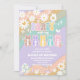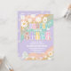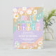 Celebre com estilo com este convite de aniversário retrô em arco-íris, apresentando listras pastel, margaridas, borboletas, sinais de paz e letras "PEEPS" em forma de coelho divertidas. Perfeito para uma festa temática de primavera ou retrô, este design alegre define o tom para paz, amor e diversão. Personalize com o nome da criança, idade e detalhes da festa para criar um souvenir único. Ideal para primeiros aniversários, festas infantis ou qualquer celebração colorida, este convite combina charme nostálgico com estilo moderno para deliciar os convidados.