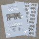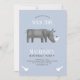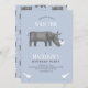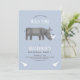 Um rinoceronte fofo e alguns pássaros decoram este convite de aniversário azul safari neutro para um menino ou menina de qualquer idade. As costas apresentam um padrão de rinoceronte. Personalize alterando o nome e o texto para se adequar à sua celebração.