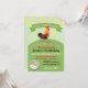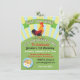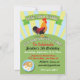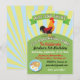 Convite de aniversário Rise and Shine Breakfast com uma placa de panquecas jovens, ovos e bacon, galo de coroa contra grama verde e fundo solar. Uma festa divertida para uma garota ou um garoto. Ilustração desenhada à mão por McBooboo.
