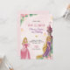 Convite de aniversário rosa Um convite de aniversário rosa para "O 3º Aniversário da Princesa Sophia" com duas ilustrações de princesas, uma em rosa e outra em roxo, rodeadas por flores e um castelo. O texto inclui detalhes do evento e informações de RSVP, em um fundo de mármore. O tom é caprichoso e festivo.