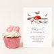 Cartão de convite de aniversário russo e branco com ilustração aquosa de cogumelos com mariposas.