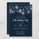 Barato de convites de festas de aniversários impressos personalizados com um modelo fácil de usar para personalização. Este design de chic rústico apresenta cadeias de luzes brilhantes de cordas e frascos de pedras em um fundo azul marinho escuro. Personalize o convite com os detalhes do seu janto de aniversário ou personalize o texto a ser usado para qualquer evento. Use as ferramentas de design para escolher qualquer cor de fundo, adicionar fotos e personalizar as fontes de texto e as cores para criar um design único para a celebração do seu aniversário.
