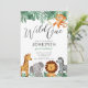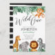 Todo o texto pode ser editado no convite. Perfeito para um tema selvagem. Possui folhas verdes, folhagem, elefante, girafa, macaco, zebra e leão.