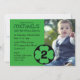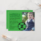 Cartão de aniversário de fotografias muito bonito para uma criança de ascendência irlandesa ou um nascer infantil em março. A fotografia da criança é à direita e os detalhes da festa de aniversário são à esquerda em um fundo verde Uma grande pedra de xamelo em um círculo preto junta-se às duas áreas. A idade da criança está escrita em um numeral grande e ousado. É adequado para um menino ou para uma menina.