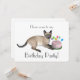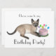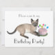 Um gatinho siamês tem um bolo de aniversário decorado. Quem não gostaria de vir à sua festa de aniversário quando você enviar este convite para um gato divertido.
