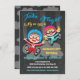 Convite de aniversário super divertido de paraquedismo interior ou exterior. Possui um menino e uma garota flutuando no ar com nuvens com fundo de quadro. Ilustração desenhada à mão por McBooboos.