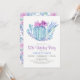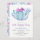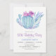 Convite de aniversário de sucesso. O convite apresenta cacto violeta roxo e azul suculento e padrão floral.