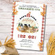 Este convite apresenta uma imagem encantadora de feno empilhado, adoráveis animais da fazenda e é acompanhado por outras ilustrações relacionadas à fazenda, criando uma atmosfera vibrante de celeiro. Colorido e completo com uma borda adornada com encantadoras plantações da fazenda, é o convite perfeito para definir o tom de uma festa divertida com tema de fazenda.