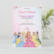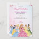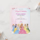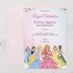 Convite de aniversário temático de princesa para o 3º aniversário da Princesa Sofia, apresentando princesas ilustradas com vestidos coloridos. Fundo com tons suaves de rosa e branco. Detalhes do evento incluem data, hora e localização em escrita elegante.