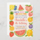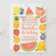 Aumente as vibrações tropicais com este convite de aniversário divertido e frutífero! Apresentando ilustrações lúdicas de melancia, abacaxi e citros com plasmas de cor tropical, este convite é perfeito para festas de piscina, aniversários de verão ou celebrações de temas lúanos. Totalmente personalizável para combinar seu evento e dar vida à diversão do verão!