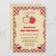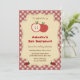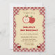 Convite de aniversário com design vermelho da maçã e fundo vermelho do teste padrão da xadrez.