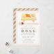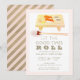 Este convite de Ano Novo "Que os bons momentos rolem" estiloso e moderno apresenta sushi pintado à aguarela em tábua de madeira com pauzinhos em fundo branco emoldurado por uma borda rosa. O verso apresenta listras diagonais em rosa e dourado falso. Altere a cor do fundo na frente e no verso e personalize-o de acordo com as suas necessidades.