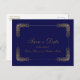 Um convite de antecedência de noivado personalizável em ouro e azul com renda ornamentada.