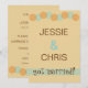 Convite de anúncio de casamento e recepção ou festa pós-casamento com design moderno e texto personalizado. Se você já é casado, fugiu ou teve um casamento em um local distante ou uma cerimônia no tribunal e está tendo uma festa de celebração de casamento posteriormente, personalize este convite de design moderno de meados do século para o seu evento. Tons sutis de aqua e laranja com círculos sobrepostos.