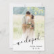 Casamento elegante e romântico "Nós fugimos" e não podíamos esperar, letra escrita à mão. Bonito tipografia para uma sensação moderna mínima e simples. Esta apresenta um casal de bô em um campo, mas qualquer foto parecerá excelente! Se sua foto não for ajustado corretamente, você sempre poderá recortá-la ANTES de carregá-la para Zazzle. Sala na parte de trás para sua recepção de casamento de posto ou festa com todas as informações.