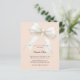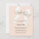 Celebre a chegada iminente de um pequeno com este elegante convite de chá de bebê cor de pêssego suave, apresentando um lindo laço decorativo marfim com detalhes delicados de pérolas. O fundo cremoso e suave em tom de pêssego cria um visual quente, feminino e atemporal, perfeito para uma celebração de chá de bebê sofisticada.