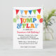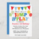 Nosso convite colorido Jump & Play Balloons em cores primárias apresenta letras, padrões e balões coloridos e faz um convite perfeito para qualquer festa infantil com um tema de salto, trampolim ou salto e brincadeira.