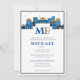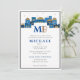O colorido Convite de Bar Mitzvah de Jerusalém Contemporâneo apresenta uma imagem da Cidade de Jerusalém no topo com um tema azul e dourado e nome em hebraico