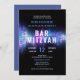 Este convite de Bar Mitzvah elegante e moderno apresenta um tema de DJ ou festa de dança com luzes coloridas de ondas sonoras em um fundo escuro. Este design é animado e atraente. Este cartão agrada a todas as idades e é perfeito para convidar os convidados para celebrar com a sua família uma celebração de Bar Mitzvah que é divertida, jovem e bem organizada. Ele dará o tom para uma cerimônia e festa de Bat Mitzvah memoráveis.