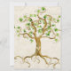 A arte para este convite de bat mitzvah de filha, elegante, formal, mas um pouco rústico, é pintada à mão com aquarela por Audrey Jeanne Roberts. O fundo é um pergaminho estilo vintage envelhecido, mais claro de um lado e em tons de bege mais profundos no verso. A árvore giratória tem um coração no centro do tronco, seus galhos são espirais e no final de cada galho há um conjunto de folhas verdes.