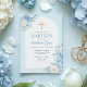 Este convite de batismo elegante apresenta uma bela combinação de flores azuis suaves e uma cruz dourada, perfeito para dar as boas-vindas ao seu bebê na fé cristã. O design suave em aquarela, combinado com a tipografia formal, torna-o uma escolha ideal para um batizado memorável de menino ou menina. Personalize este convite com seus próprios detalhes para criar um lembrete pessoal para amigos e familiares. Seja para uma grande cerimônia ou evento íntimo, este convite de batismo adiciona graça e beleza a qualquer celebração religiosa. Um design atencioso que transmite pureza, fé e novos começos.