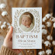 Celebre o batismo do seu pequeno com este elegante convite de batismo em estilo boho, apresentando uma paleta de cores neutras e suaves, uma foto adorável da bebê Olivia Grace e delicados acentos de coroa floral. Uma escolha perfeita para uma celebração de batismo chic e moderna.