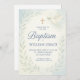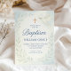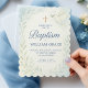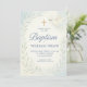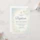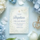 Este elegante convite para o batismo azul apresenta um carregando pacífico de pomba-d-água em um galho de oliveira, uma cruz ouro e sotaques botânicos de folha mole. Preparado para calmar tons pastéis com fontes tradicionais de serifa e script, este convite é uma bela escolha para celebrar o dia especial do seu bebê.
