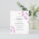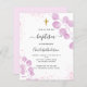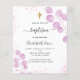 Um convite de batismo moderno e elegante. Um fundo branco chic decorado com folhagem de eucalipto rosa e brilho falso. Personalize e adicione a foto da criança, nota de agradecimento e nome.