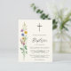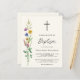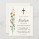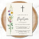 Este convite de Batismo econômico é decorado com flores silvestres e uma cruz sobre um fundo suave creme.