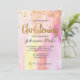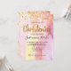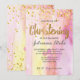 Tão moderno, este convite apresenta um fundo de aquarela rosa e letras e confetes em dourado caindo ao fundo.