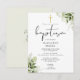Este cartão postal de convite de batismo com folhas de botânica elegantes pode ser personalizado com suas informações em tipografia chic com suas iniciais de monograma no verso. Criado por Thisisnotme©